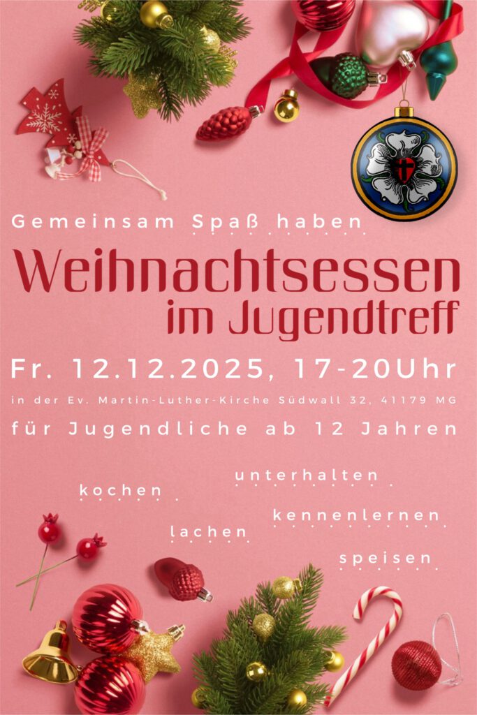 Die Weihnachtsfeier für Jugendliche ab 12 Jahren ist am Freitag, dem 12. Dezember, von 17 bis 20 Uhr – wir essen eine Kleinigkeit und stimmen uns auf die Festtage ein.